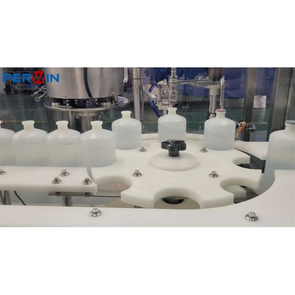 The PW-ZGS1210 uses manual bottle loading and turntable transporting to filling machine for bottle feeding, which makes it easy to operate. It also has a CIP system available, which makes it easy to clean after use.